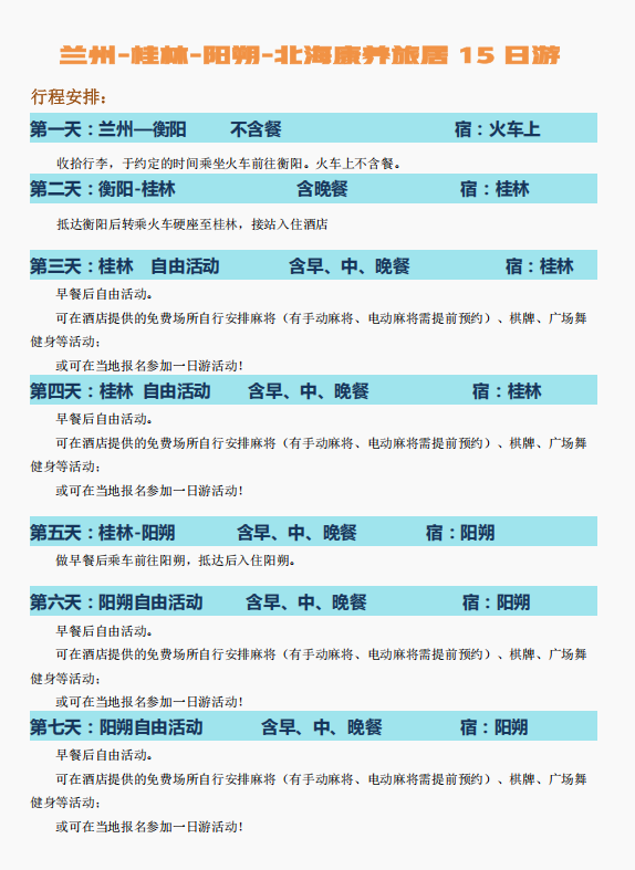 1.凡身心健康,乐观向上者均可报名,有严重高血压、心脏病、哮喘病等易突发疾病及传染病、精神疾病患者谢绝参加,如有隐瞒病情者后果自负,且病情严重者我社有权劝退或终止合同。70 周岁以上老年人须亲属陪同;